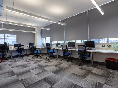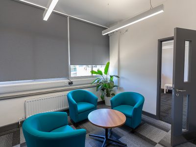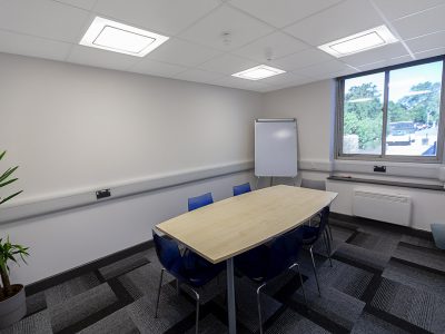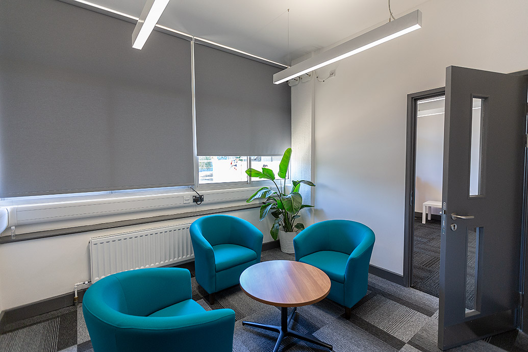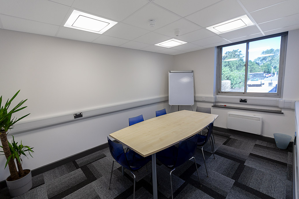 Bulkheads in the ceiling meant a grid ceiling was not possible throughout the office suite, so a mix of both linear and 600×600 fittings were used; Dextra’s Runway Continuous Surface/Suspended with sensor and the MOD Office were installed in the office spaces and meeting rooms. The MOD Office has been designed specifically for applications where monitors are used in areas such as classrooms and offices and was selected for this project to ensure the architectural feel was consistent throughout the workplace.