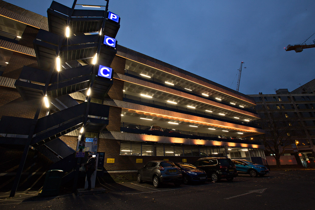 LEDextra was instructed to create an exterior lighting installation that would illuminate the car park’s front facia of four floors and its main external stairwell tower to the side of the building. The successful lighting solution would need to:
