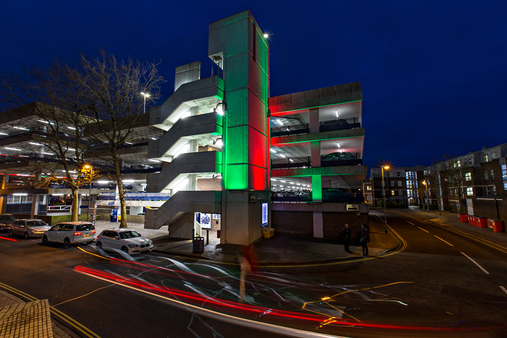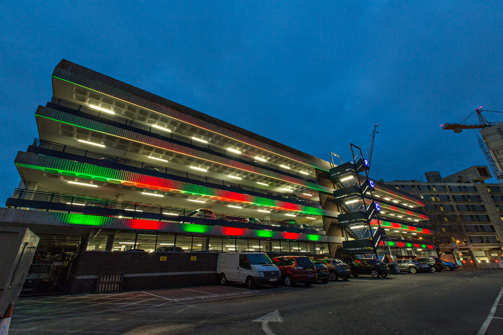 Using digitally controlled LED products of the highest quality, LEDextra produced a colourful and dynamic light installation for Portsmouth’s Isambard Brunel car park. The site’s exterior walls have now become a prominent feature in Portsmouth’s city centre, acting as canvases for light shows that change theme with festive seasons and public holidays.