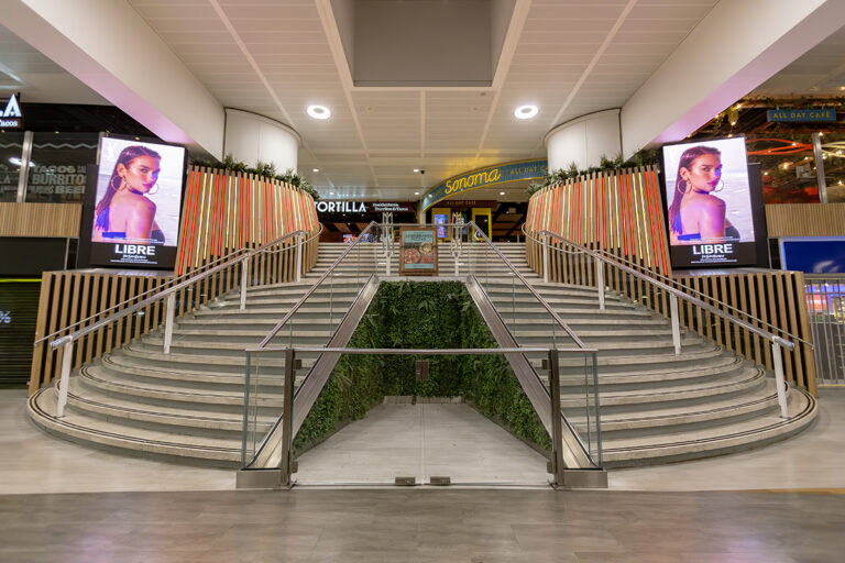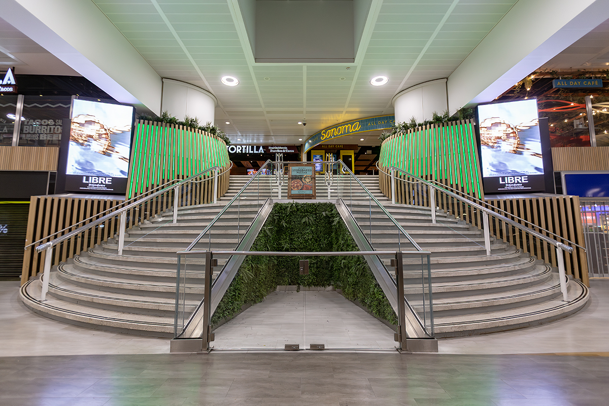In addition to the stair and escalator features, LEDextra’s Glide Mini was installed as a wall-grazing solution to highlight the retail “Moss Walls” within the concourse.