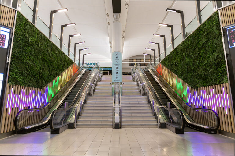 At the centre of the project was the Glide Pixel RGBW, specified for the staircase and escalator walls. This direct-view, diffused linear luminaire incorporates 100mm individually addressable sections, enabling a wide range of dynamic effects. To manage the system, LEDextra supplied a Pharos Designer control system, commissioned by Darren Parlby of Oakcroft Technical. The system allowed a variety of programmed sequences, including London Gatwick’s signature blues, red/white/blue stripes, Pride rainbow effects, seasonal scenes and celebratory displays.