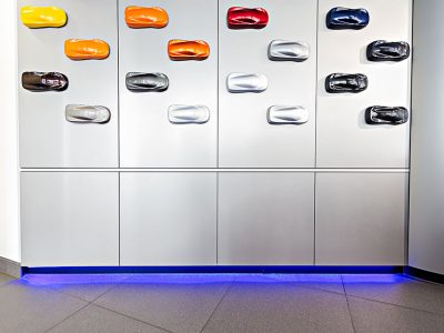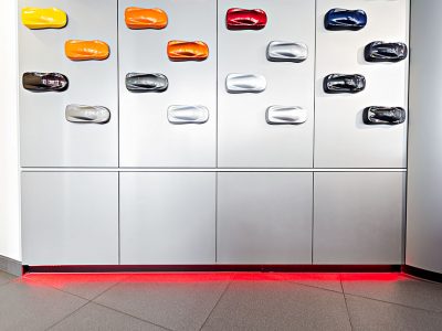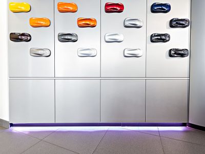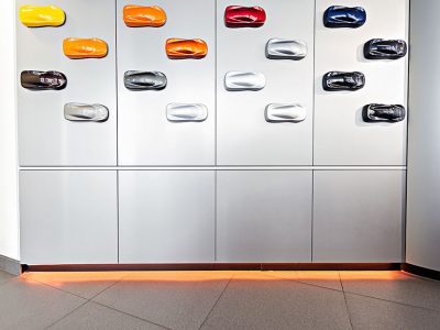 Light and colour are used very creatively in these contexts, to elicit a specific emotional connection with the cars on display and ultimately create an atmosphere that will encourage sales.