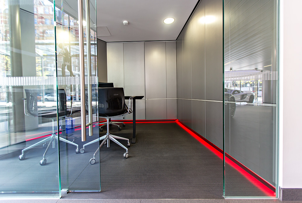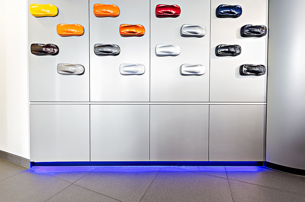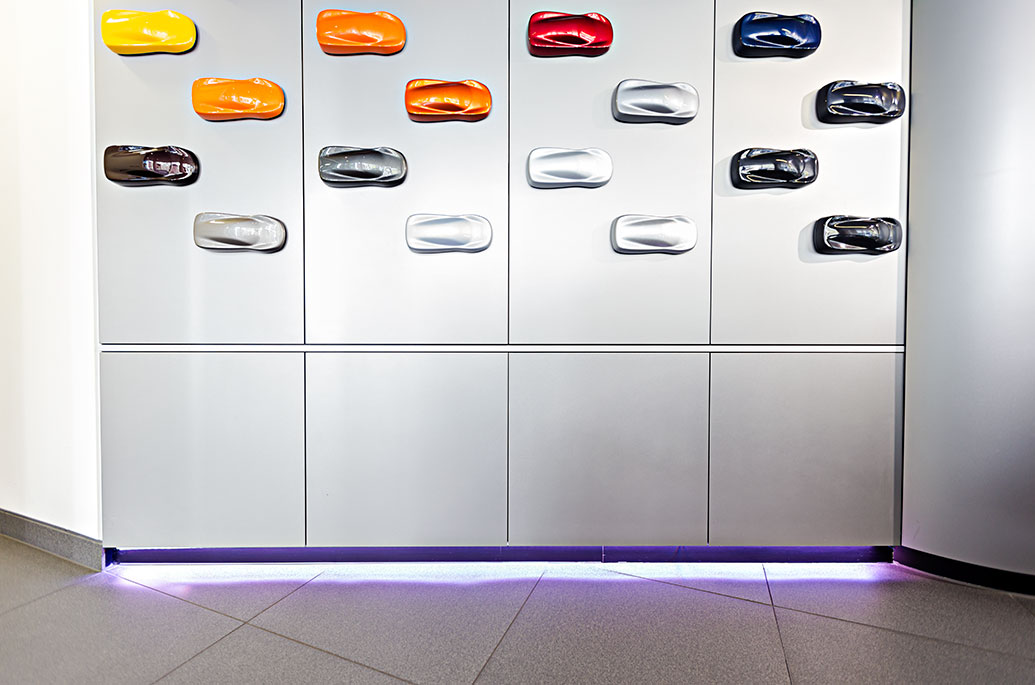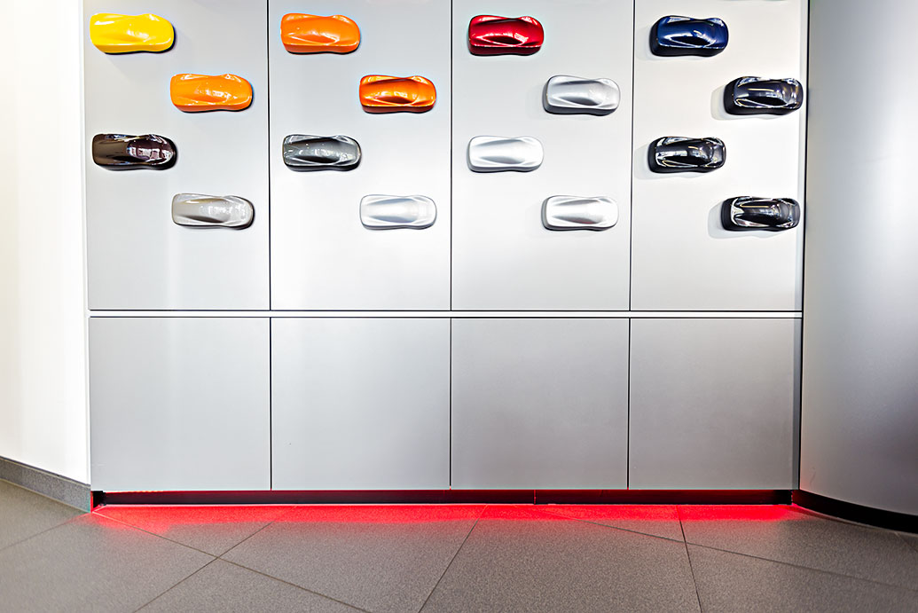 Coloured accent lights can be an effective way of providing aesthetically appealing orientation lighting, helping to create a guided flow within the showroom.