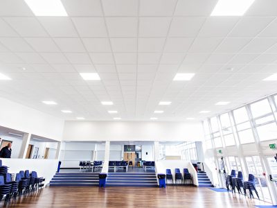 The successful selection of luminaries included the popular MODLED for the school’s 4.5m high assembly hall and its capacious dining hall. The versatile recessed luminaire is commonly used in areas with lower ceilings such as receptions, offices and classrooms. however when customised to a high output variant of 6800 lumen, it becomes suitable for higher level lighting. As a result, its attractive, minimalist design enhanced both spaces; with its high transmission polycarbonate diffusers offering a high quality and uniform distribution of light.