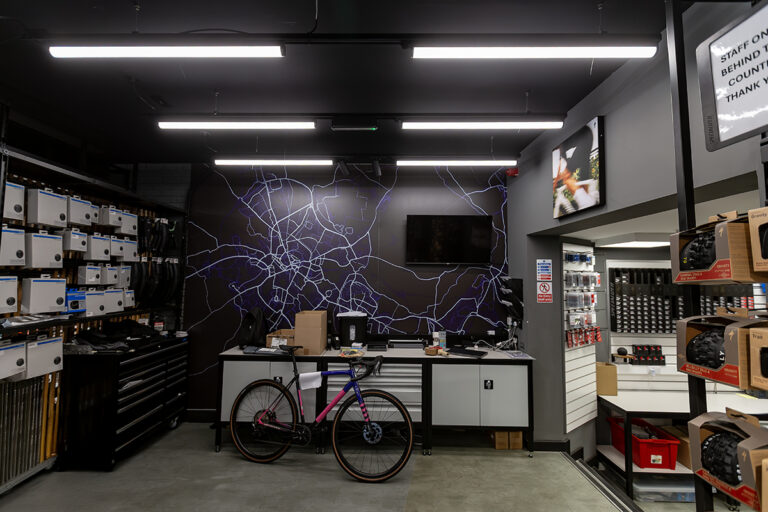 We were asked to develop an energy efficient lighting scheme for a new retail outlet in Stafford, the aim was to provide a welcoming and visually engaging lighting solution that would help to showcase the bicycle displays. The system had to be quick to install and simple to maintain with the flexibility to be changed easily given the fluidity of the store layouts. In addition to this we were asked to accentuate the diverse range of colours throughout the store and include feature lighting to highlight the key product display areas.
