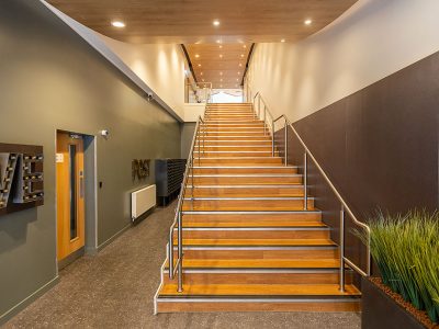 Chosen for the choice of coloured bezels it offers, which matched the architect’s requirements, 240 of Dextra’s Protec Fire Rated Downlight were installed in the entrance way to the building as well as the first-floor communal areas and cinema room. The Protec Fire Rated Downlight has been developed to offer customers a high-quality LED alternative to the traditional GU10 downlighter and incorporates the latest chip on board LED technology. This fixed position variant is both IP65 and fire rated.