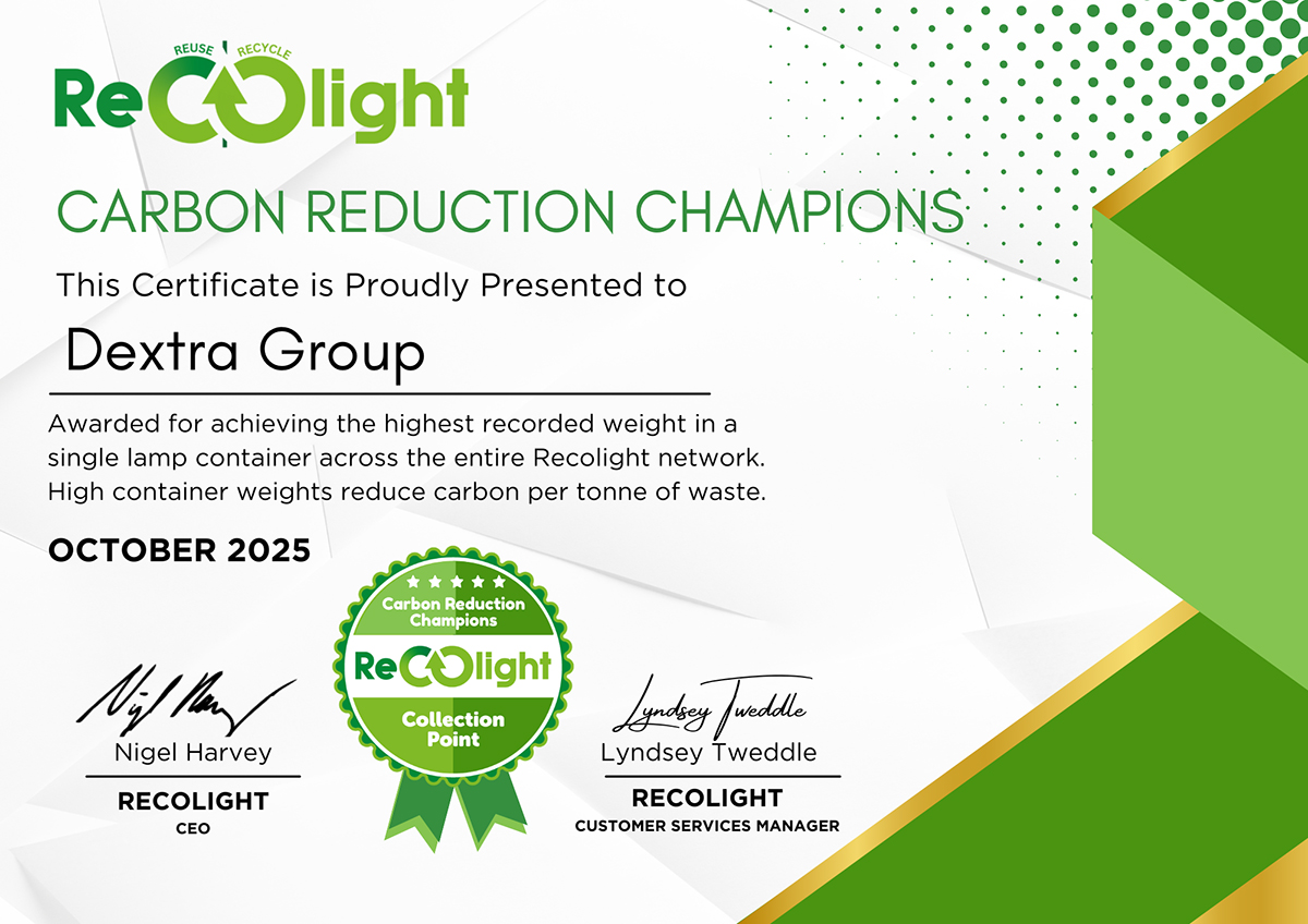 Dextra Group are Recolight’s October winner of their Carbon Reduction award. This new Recolight monthly initiative is to recognise those achieving the highest recorded weight in a single lamp container across the entire Recolight network.