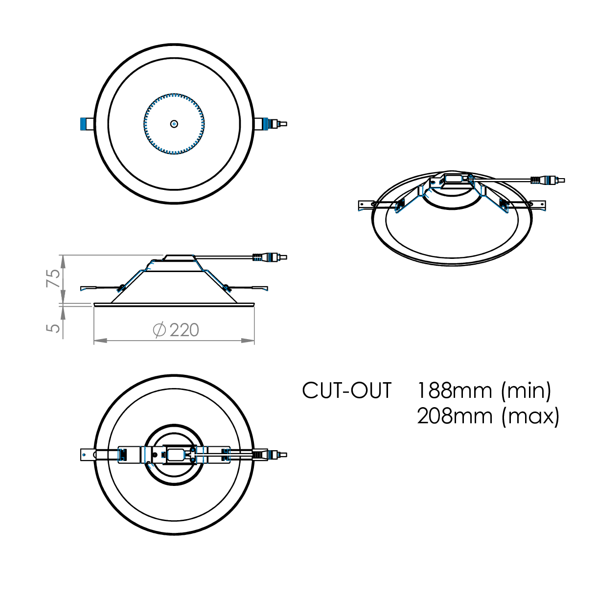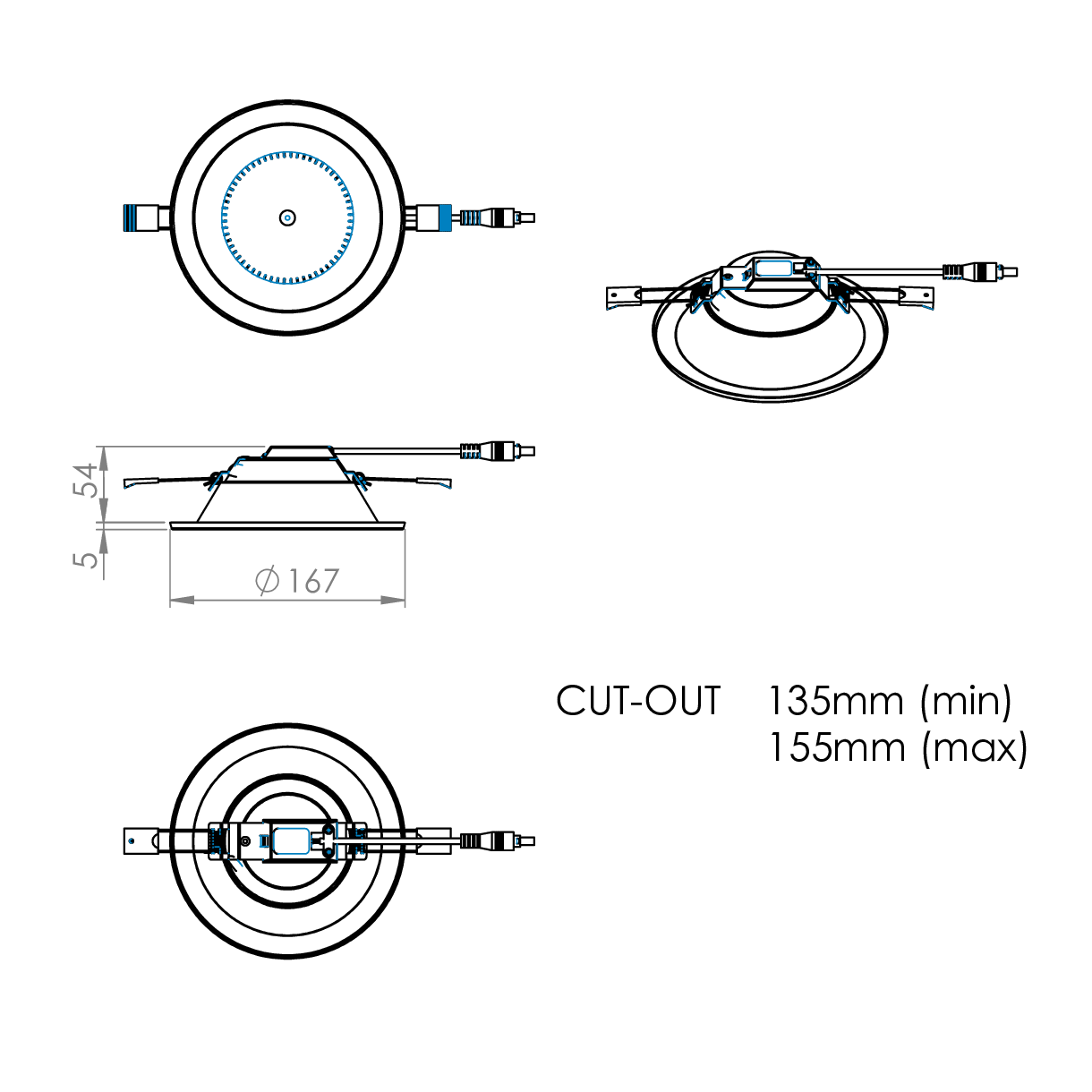 The BTEC range comes in two sizes, 167mm diameter and 220mm diameter but can be supplied with a range of infill rings where required if your ceiling cut out is not compatible with the standard luminaire range.