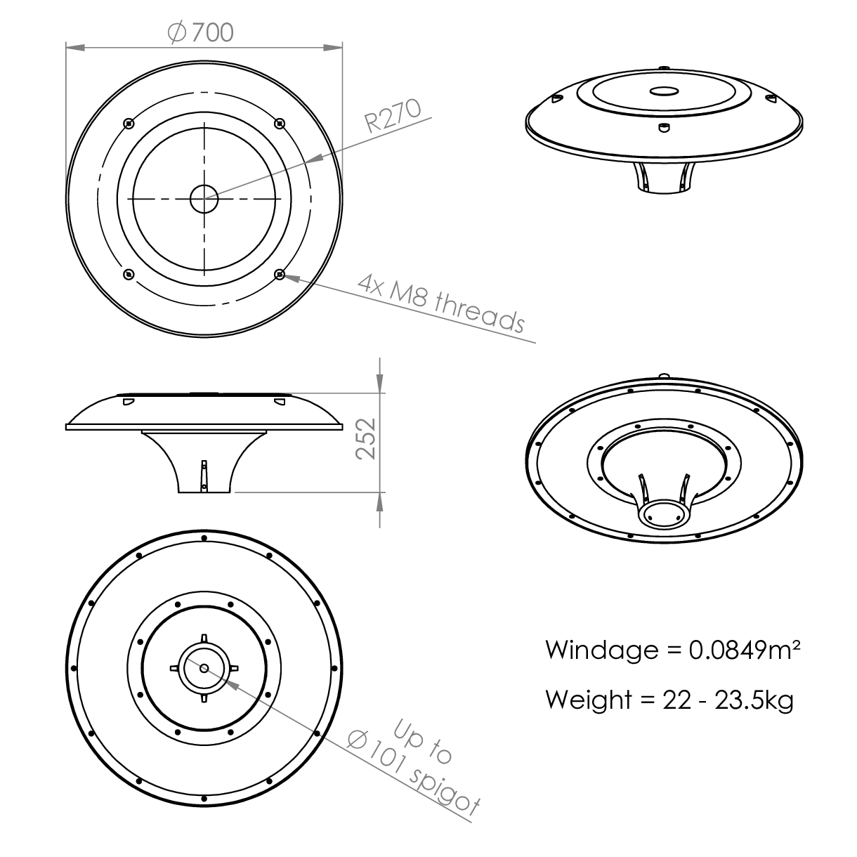 - Finish: Polyester powder painted RAL 9006 matt grey, marine grade salt spray tested